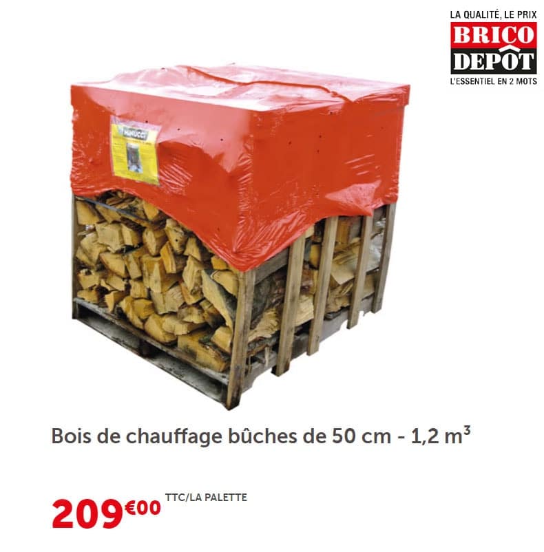 Idéales pour les foyers ouverts, les inserts et les poêles, Brico Dépôt propose des palettes de bûches de 50cm ou 33cm en conditionnement de 600kg, soit 1,2m3, c’est à dire 1,7 stères de bois.