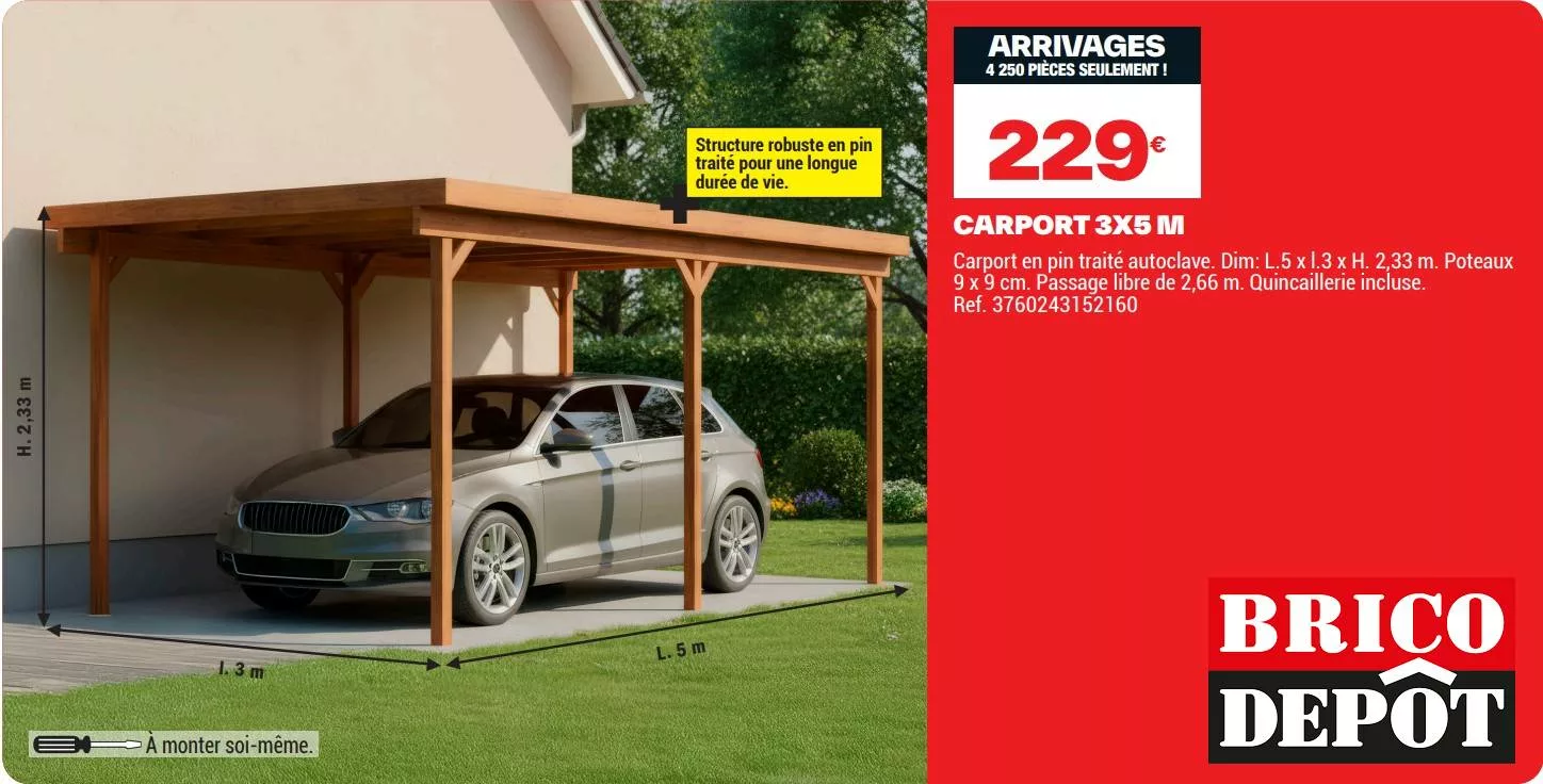 Vous recherchez un carport Brico Dépôt au meilleur prix pour protéger votre véhicule des intempéries ? Le nouvel arrivage du 27 février 2026 propose un modèle 3 x 5 mètres en pin traité autoclave à seulement 229 €. Une solution économique et durable pour abriter une voiture, une moto ou même du matériel de jardin.