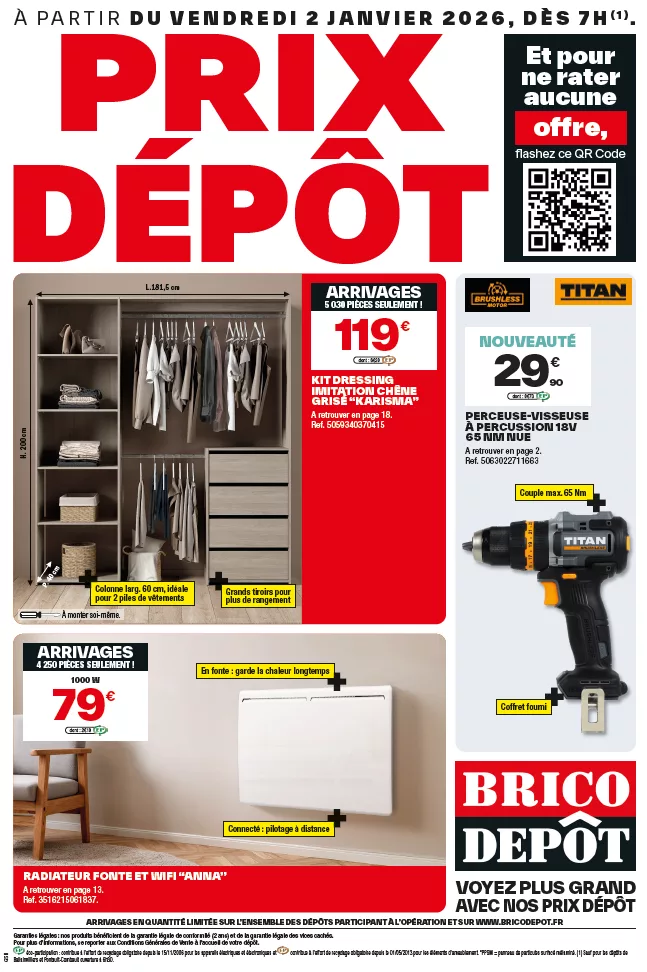 La page 2 du catalogue Brico Dépôt de janvier met à l’honneur une sélection complète d’outils électroportatifs TITAN 18V, accompagnés de leurs accessoires. Une gamme cohérente, moderne, équipée de moteurs brushless, pensée pour couvrir l’essentiel des besoins sur chantier comme à l’atelier.