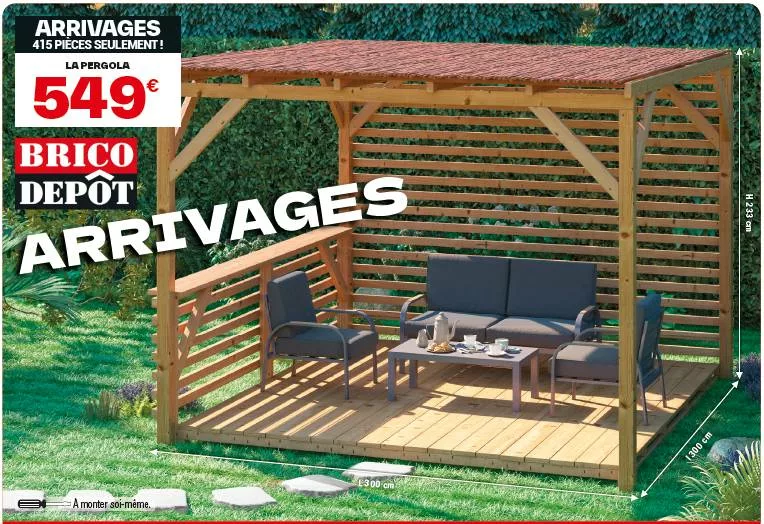 Brico Dépôt propose ici une pergola en bois massif qui combine robustesse, simplicité et prix accessible.